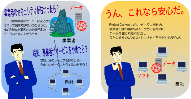 Project Canvas は、クライアントPCにインストールするソフトで、データも利用者のパソコン(クライアントPC、または利用者の事業所内のサーバー)に蓄積します。そのため、セキュリティの確保は利用者の責任範囲となりますが、LANでの一般的なセキュリティを講じておけば、Project Canvas のデータも守られます。少なくとも、事業者(ルミックス)がデータの内容を知りうることはありませんし、利用者のデータが事業者を経由して漏洩するようなことも起こりえません。