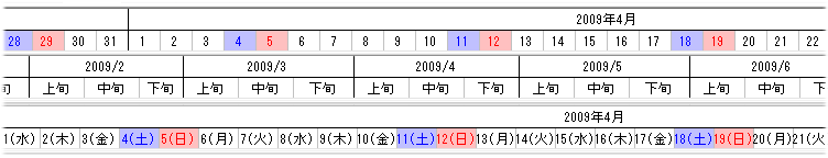 ルーラーは、上段と下段を別々に設定できます。それぞれ日・週・旬・月・年の中から単位を選ぶことができ、単位に応じて表示形式も変えることができます。ルーラーは、必ず上段よりも下段が細かくなるように指定します。上段では、「日」を単位とすることはできません。